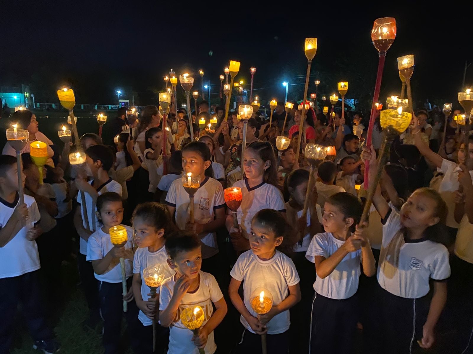 La cancha de fútbol ubicada al lado del local educativo fue iluminada con un total de 8.000 candiles fabricados por los propios alumnos de todos los niveles, que suman 450, explicó la directora. En distintos sectores se colocaron las 14 estaciones del viacrucis donde los actores, alumnos de la institución, recrearon la pasión y muerte de Jesús, desde su condena por Pilato hasta su sepultura.